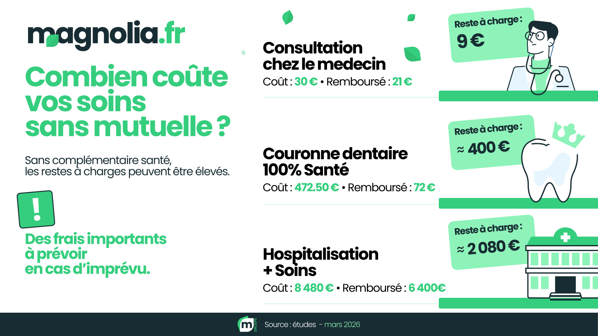 → Reste à charge sans mutuelle : environ 400 € - Hospitalisation (coût moyen estimé : 8 480 €)